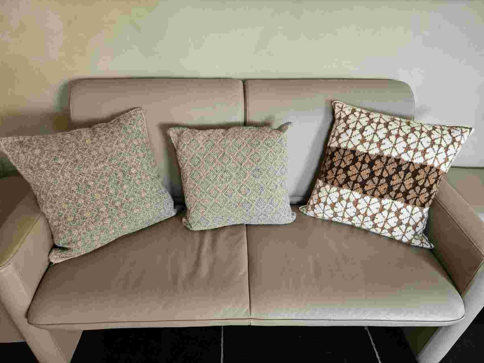 Deze kussens zijn gebreid met 100% alpacawol van de beste kwaliteit. De vulling is alpacawol van de nekdons die apart te verkrijgen is per kg. Dit is een voorbeeld, niet te koop.
